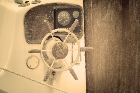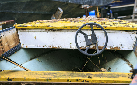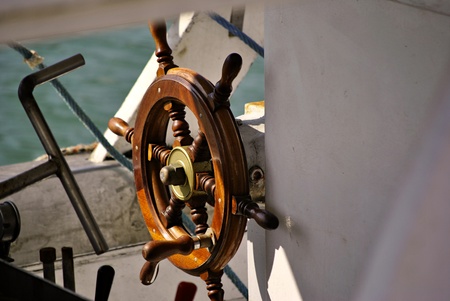 vintage boat wooden steering helm on a fisherman ship in the harbor