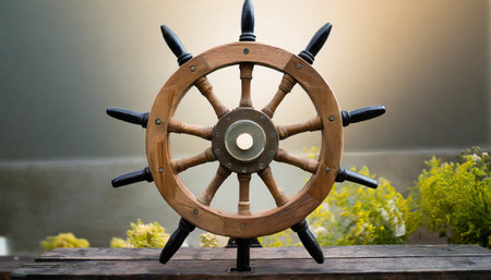 A close-up showcases a wooden ship wheel, the central focus of a vintage interior scene. Warm tones from the wooden surfaces dominate the image, with natural light entering from a window. The setting appears to be an indoor space, perhaps a ship's cabin, suitable for various editorial and commercial applications.
