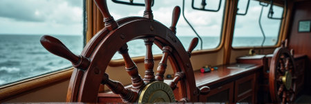Nautical scene from a classic wooden ship's wheelhouse overlooking the ocean. That the image is generated using AI.
