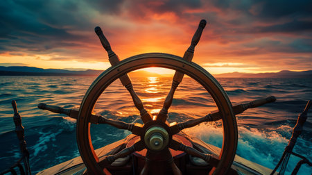 Sailing the Boundless: Ship Wheel on Yacht amidst Vast Sea and Sky at Sunset, Generative AI