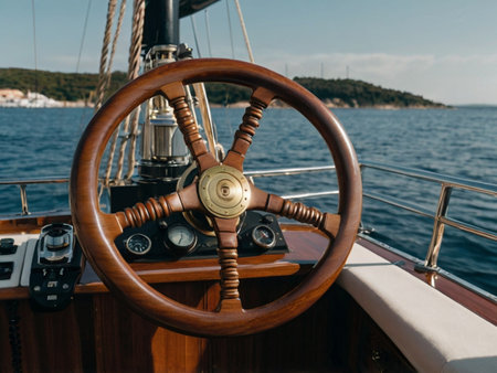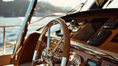 the ship wheel of a sleek yacht against the vast expanse of the sea, evoking a sense of freedom and exploration