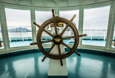 wood steering wheel in big ship