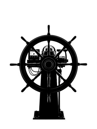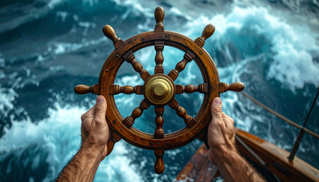 A ship's helm with a firm grip, symbolizing control and direction in leadership