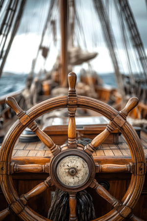 A close-up view presents a ship's wooden helm situated on a deck, with a vast ocean and cloudy sky in the background. The scene features natural lighting and a realistic style. This image is suitable for illustrating themes related to travel, adventure, and maritime concepts. It can be used for various commercial projects.