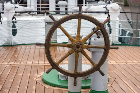 Wooden steering wheel on an old ship