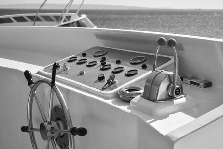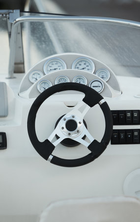 White yacht dashboard outdoors, close-up view