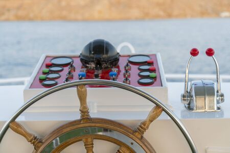 Captain's cabin and steering wheel, close-up on a yacht.