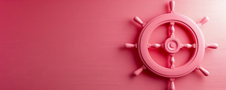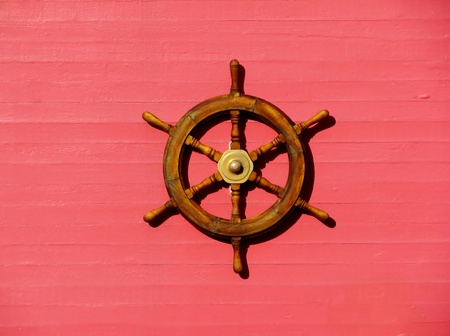 Steering wheel of the ship on a pink wall