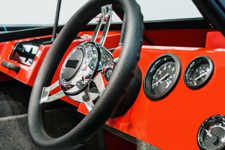 steering wheel on the dashboard of a boat or motor boat. focus on the middle of the steering wheel