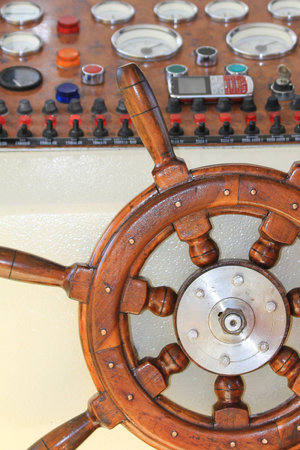 Wooden steering wheel of a yacht. Steering wheel and dashboard.