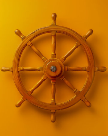 Vintage Wooden Ship Wheel Isolated on Yellow Background Representing Nautical Adventure, Maritime Exploration, Coastal Living, Seafaring Tradition, and Oceanic Journeys AI Generative