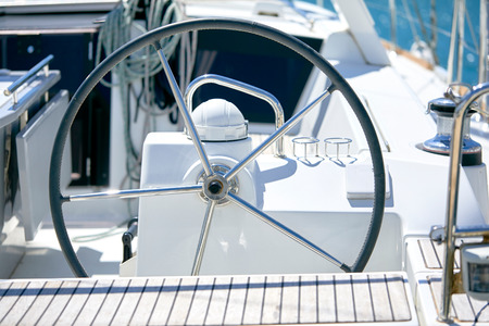 Steering wheel on the deck of a sailing yacht, close-up