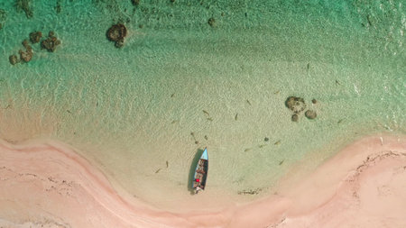 Aerial view of a lonely boat anchored near a pink sand beach in tropical turquoise water with baby sharks swimming around, creating a serene and idyllic scene