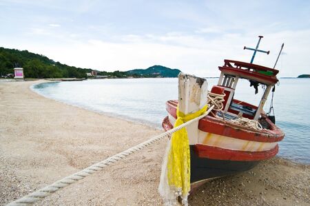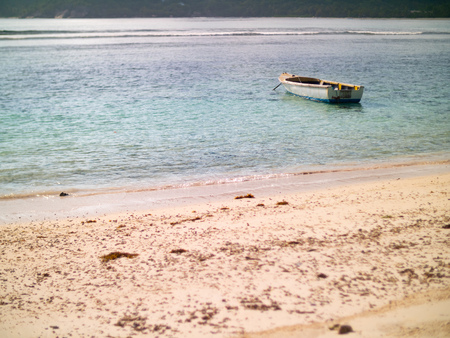Vintage floating boat sea on beach with anchor, sea light in morning.