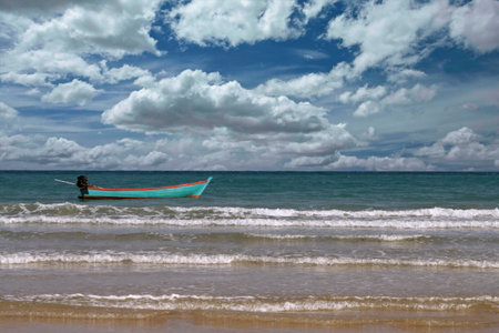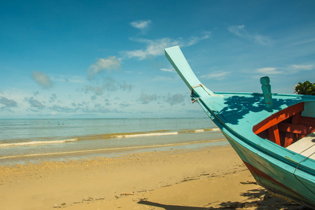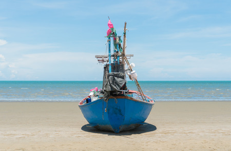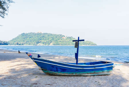 Blue fishing boat or fisherman boat or ship on Sam Roi Yod bech Prachuap Khiri Khan Thailand with blue sky and cloud and blue sea. Landscape or scenery for summer season concept