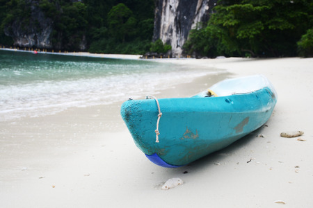 Thai traditional wooden longtail boat and beautiful sand beach at Tonsai beach in Krabi province. Ao Nang, Thailand.