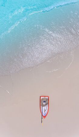 Boat near the beach. Blue water background from top view. Summer seascape from air. Aerial landscape. Travel image