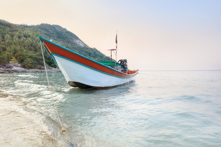 Colorful fishing boat at sand beach with sunrise on the morning.