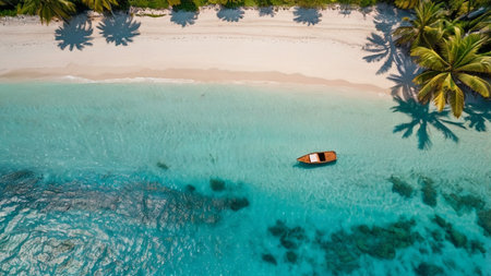 Aerial top down view of paradise beach with coconut trees and lonely tourist boat in turquoise shallow lagoon water