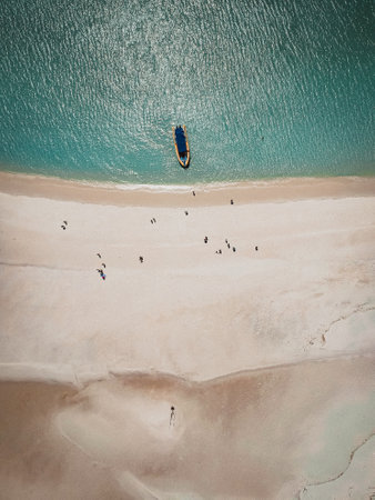 Aerial view of alone fishing boat in transparent blue water at sunset in summer. Top view of boat from drone , sandy beach in Zanzibar. Travel. Tropical seascape with motorboat, sea. View from above
