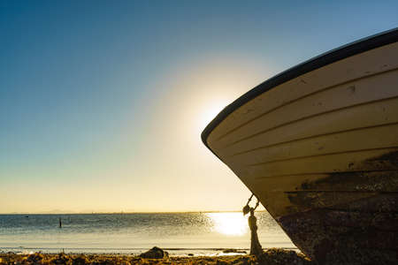old wooden fishing boat lying on a seashore. Clear and sunny day. fair weather and blue sky
