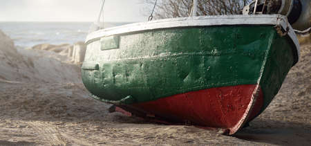 Old green fishing boat standing on land in a small village, sandy shore of the Baltic sea. Jurmalciems, Latvia. Vessel, transportation, logistics, industry, fishing, farm, food production. Rural scene