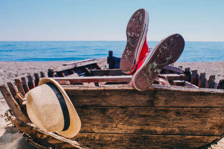 Old boat staying on the sand. Young traveller in red shoes laying in the boat and resting. His straw hat hanging on the boat too.