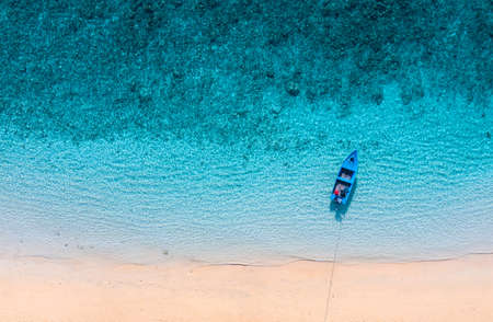 Boat near the beach. Blue water background from top view. Summer seascape from air. Aerial landscape. Travel image