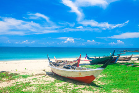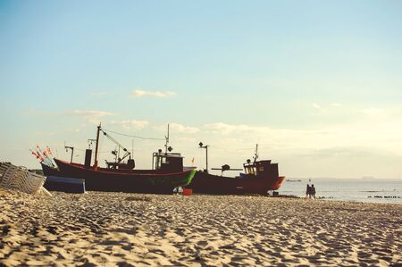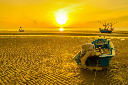 Fishery boat with sand beach and warm lighting daylight.