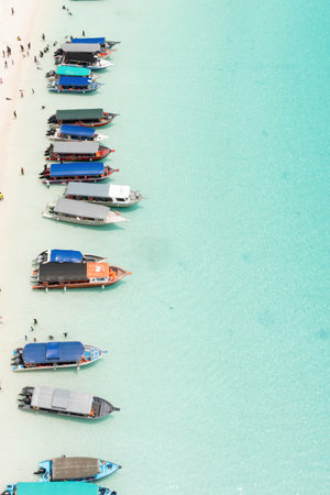 Top view of beautiful sand beach with traditional boat at Phuket.