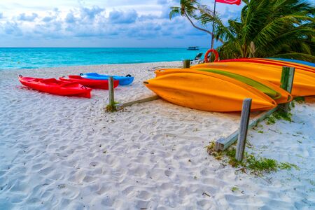 Colorful boats lying on the beach of sunny tropical island, against a bright blue sky and turquoise water, Maafushi Island, Maldives, Indian Ocean. Amazing tropical holidays.