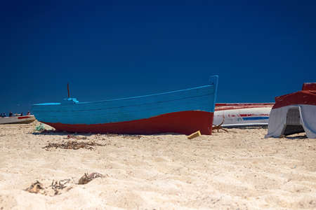 Beautiful view of the boat in the bay of the Mediterranean Sea at low tide on the beach on the island of Djerba, Tunisia