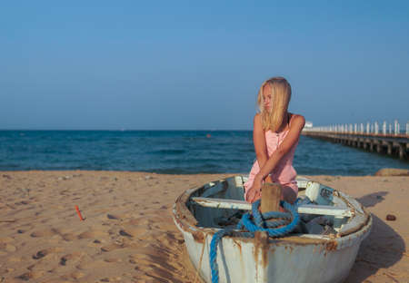 teenage girl with blonde hair sit on an old boat to the shore of the sea