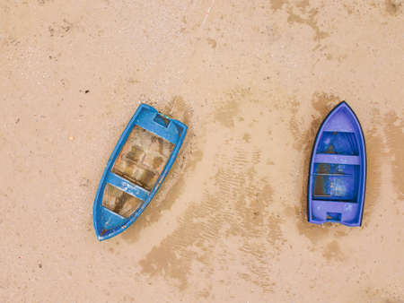 Aerial top view of a traditional fisher boats on a sand beach.