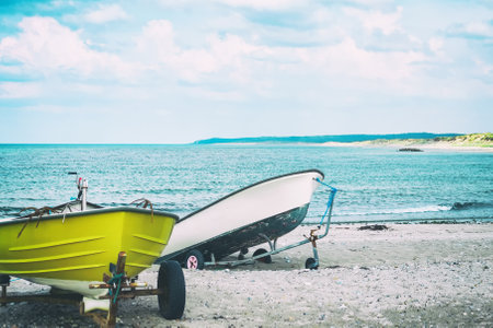 Fisherman's boat in dry dock on a beach with the sea and the horizon in the background. Graphic Landscape; Marine. Beach with boat and ocean in the background.