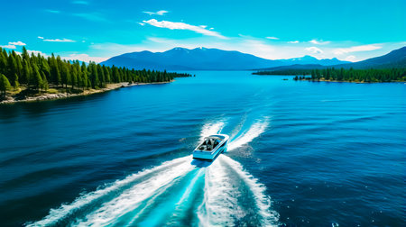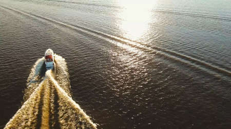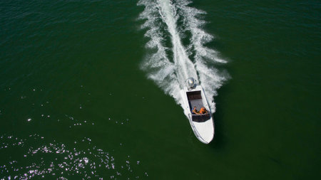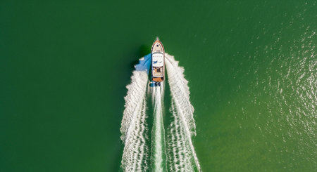 An overhead perspective reveals a white boat cutting through dark water, creating foamy wakes. The composition highlights the vessel's movement, with the sun casting highlights on the water. Suitable for illustrating travel, leisure, or transportation concepts, this image offers potential for diverse commercial applications.