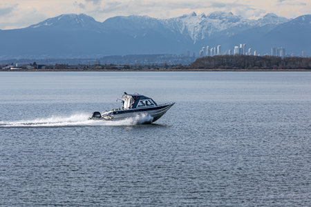 A lightweight modern fishing boat on high speed in the sea. A small recreation fishing speed boat in the blue waters. Copy space for text