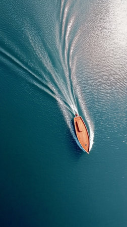 Aerial view of a motorboat creating a curved wake on a vast expanse of deep blue water, conveying a sense of speed, adventure, and the beauty of marine travel