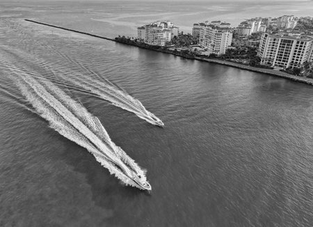 Aerial view of a fast boat creating dynamic waves in crystal blue ocean water. Perfect for conveying adventure and summer leisure activities.