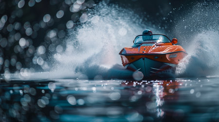 High-performance motor boat cutting through dark waters. Captured from a top view, with vibrant orange seats powerful movement and design for promoting water travel.