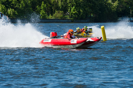 Minsk, Belarus - May 10, 2013: Panorama of bright hydroplane racing boat glides over the water surface
