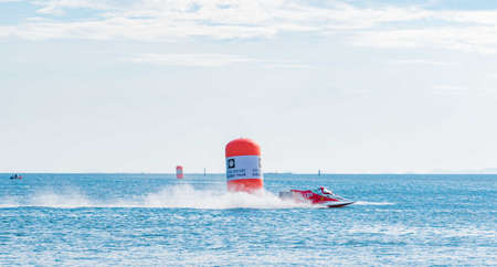 CHONBURI, THAILAND-NOVEMBER 25, 2017 : F3 boat with beautiful sky and sea in Bangsaen Power Boat 2017 at Bangsaen beach in Thailand