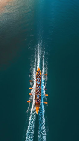 Aerial view of a racing boat in the middle of the sea, A bird's-eye view of a rowing team in perfect sync, AI Generated