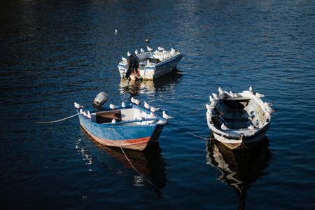 This image showcases vibrant and weathered fishing boats docked at a harbor, highlighting intricate textures and colors that evoke a sense of rustic charm and maritime culture.