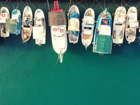 Panoramic Aerial view on boats moored in the pier, drone shot directly above.