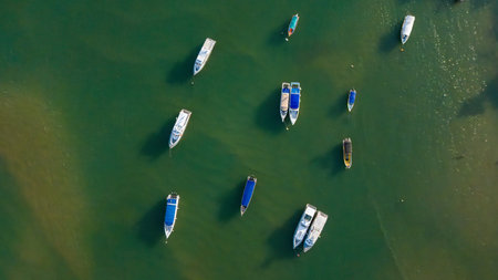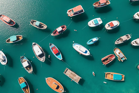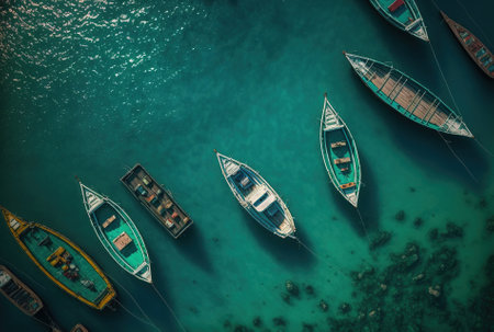 A stunning aerial view showcasing an arrangement of vibrant boats floating peacefully on a calm blue water surface, ideal for travel or nature themes.