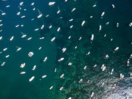 Overhead aerial drone view of yachts in mediterranean sea in summer sunny day near Nice, cote dazur, south France