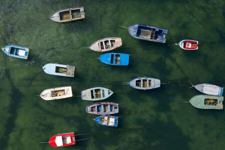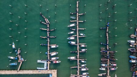 Top view from sky of group of wooden fishery boat at the sea marina with day lighting.