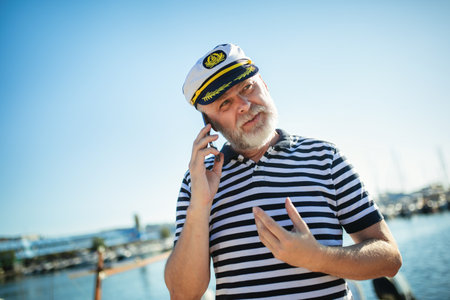 Mature man standing near the sea dressed in a sailor's shirt and hat using smart phone