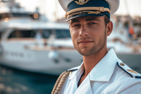 confident captain standing in front of a luxury yacht. The captain exudes a sense of professionalism and expertise, with the impressive yacht in the background